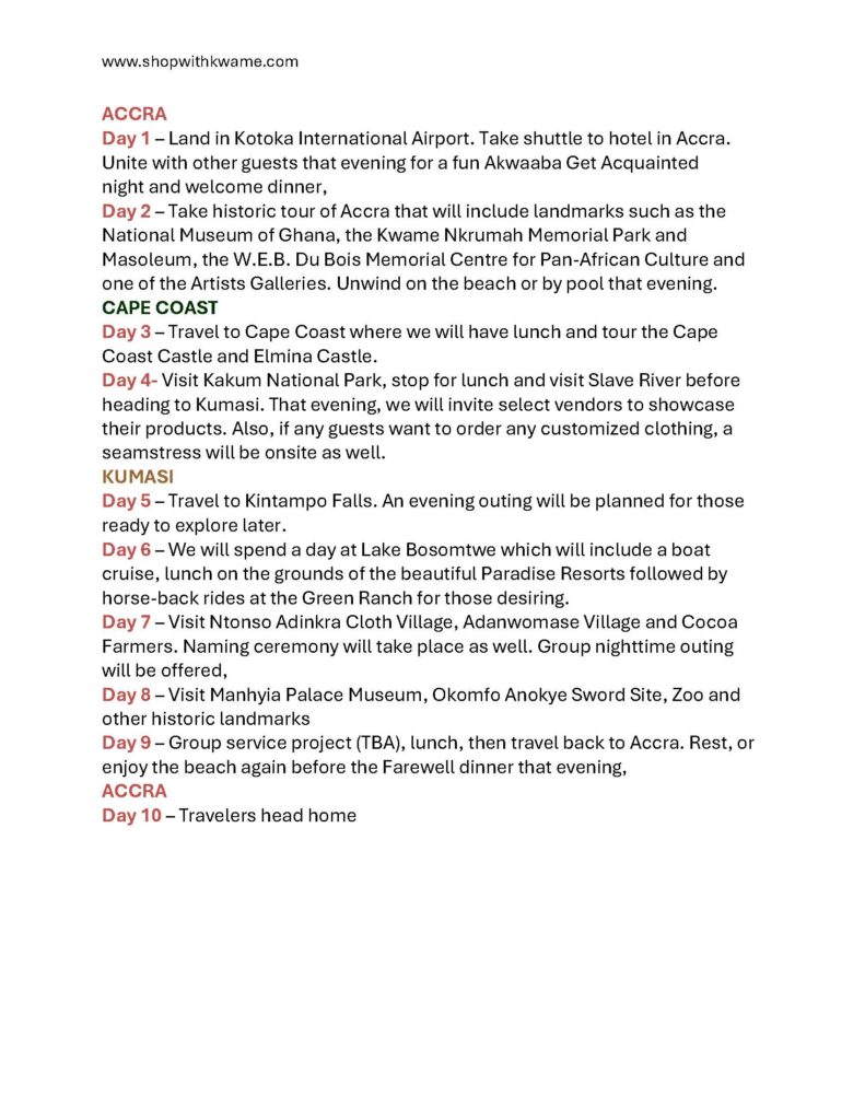 This tour is a great value for the money – included are two meals, daily breakfast, ground transportation to all planned activities, domestic flight back to Accra on final day, admission to all scheduled events, hotel accommodations, and more.